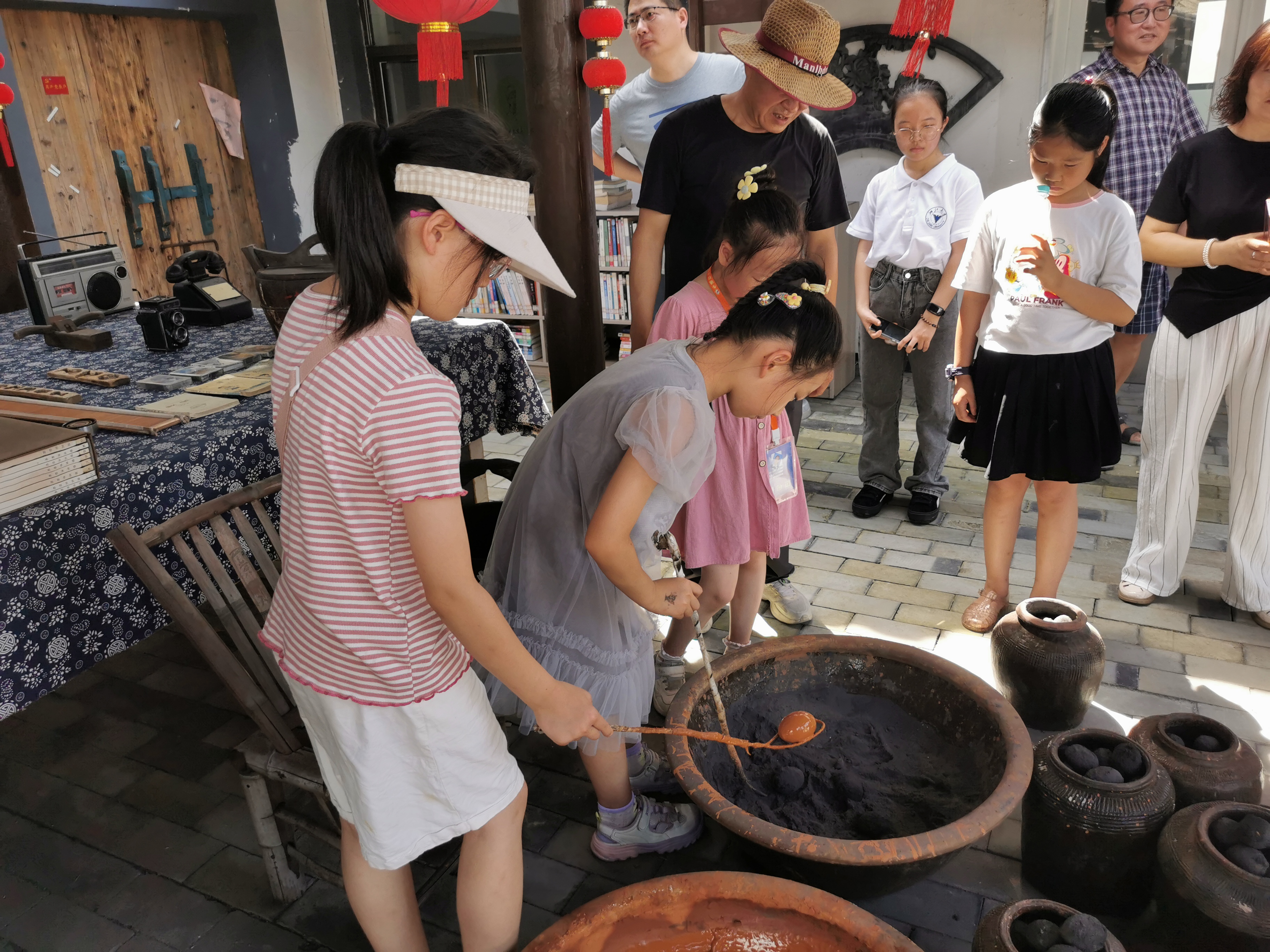 在院子主人的热情接待下,小记者们首先迎来第一项体验——咸鸭蛋腌制。在非遗传承人的指导下,他们小心翼翼地挑选着新鲜的鸭蛋,将鸭蛋一一浸入调好的配方之中,而后裹上草木灰。这个过程虽然简单,却蕴含着时间的魔法,让人期待着未来几周后,这些鸭蛋将如何蜕变成餐桌上的美味佳肴,同时也体会到了食物制作中的耐心与期待。